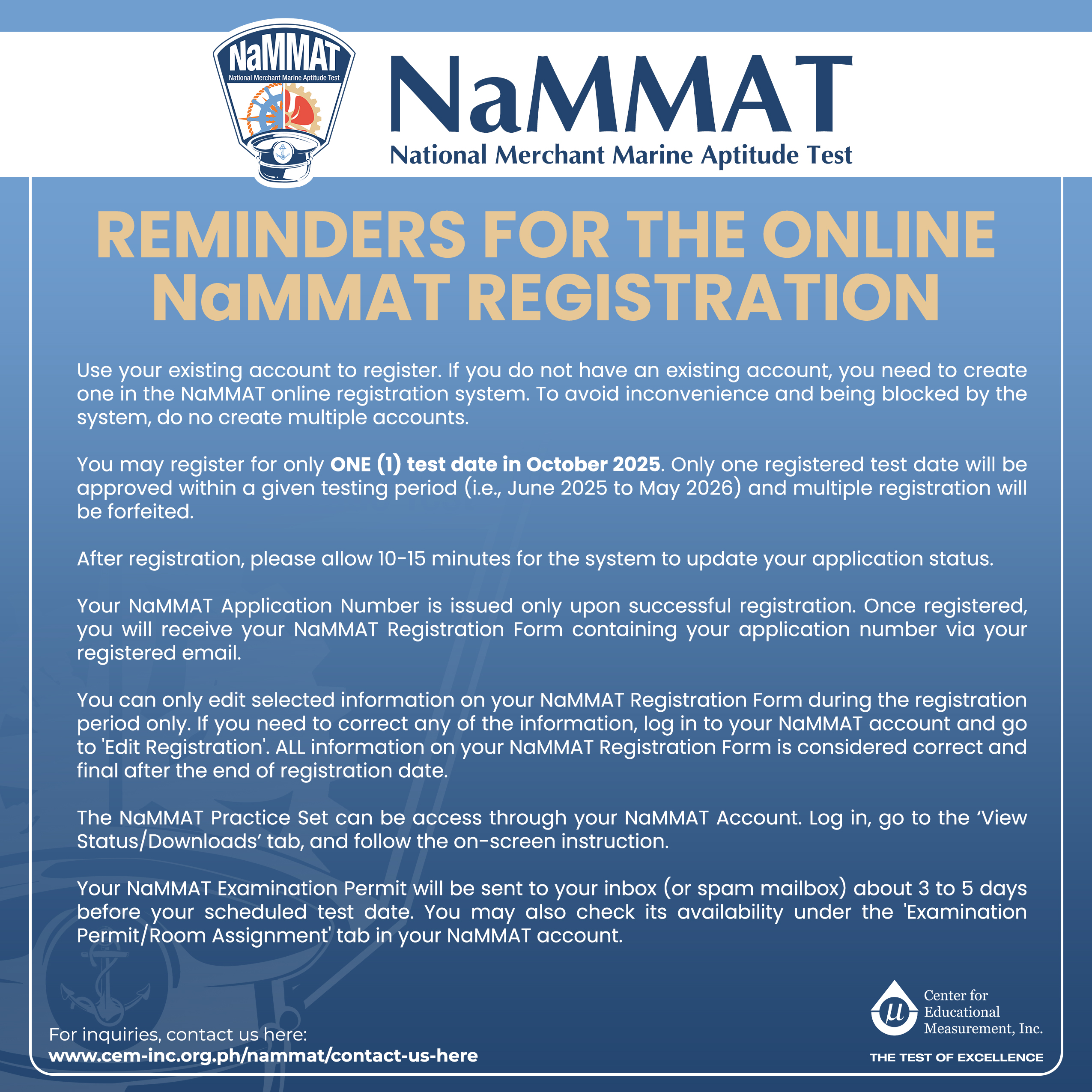 The Center for Educational Measurement, Inc. (CEM) has been authorized by the Commission on Higher Education, through CEB Resolution Nos. 669-2022 and 543-2025, to develop and to administer the National Merchant Marine Aptitude Test (NaMMAT).