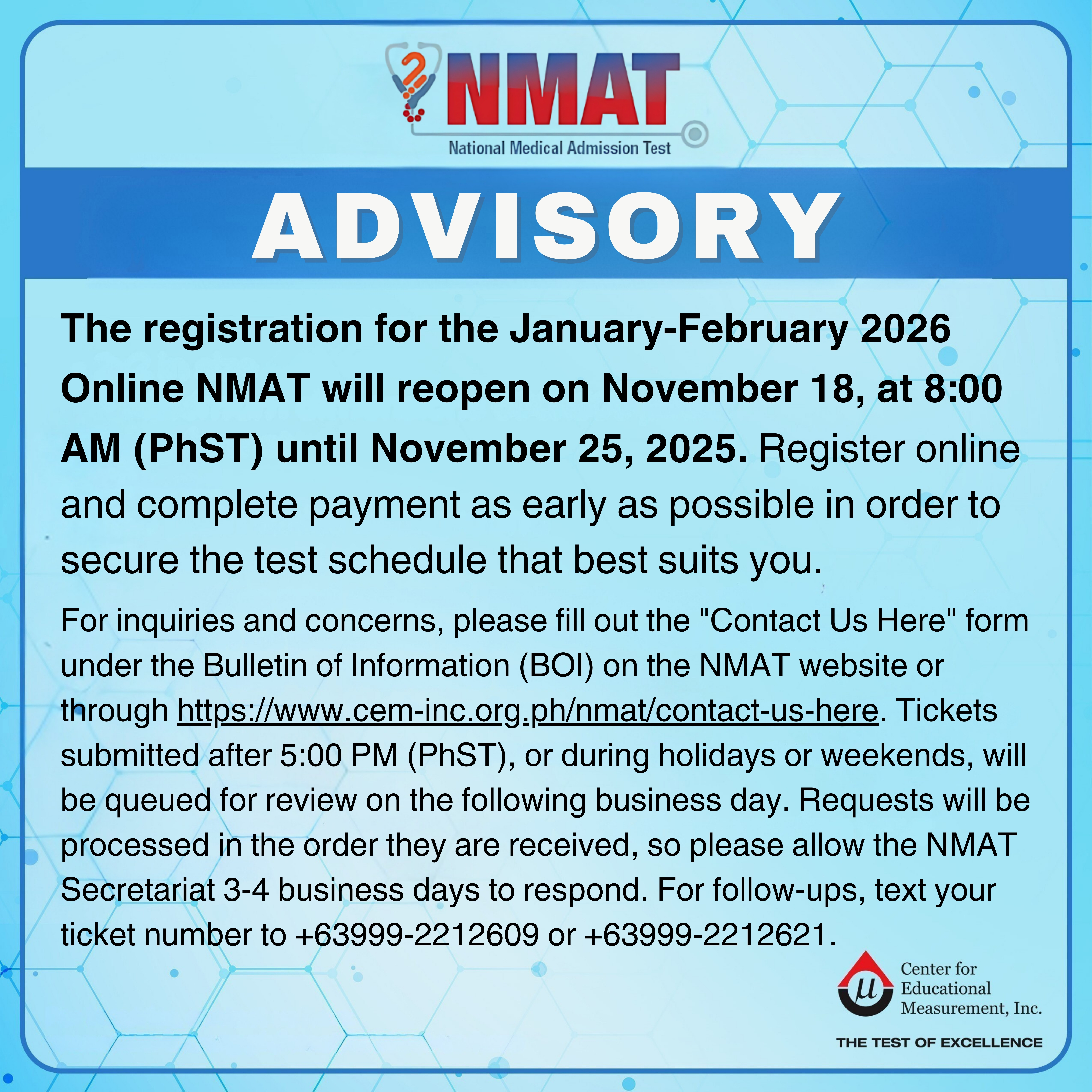 The Center for Educational Measurement, Inc (CEM) has been commissioned since 1985 by then Board of Medical Education (BME), under DECS Order No. 52 series 1985, to develop and administer the National Medical Admission Test (NMAT).